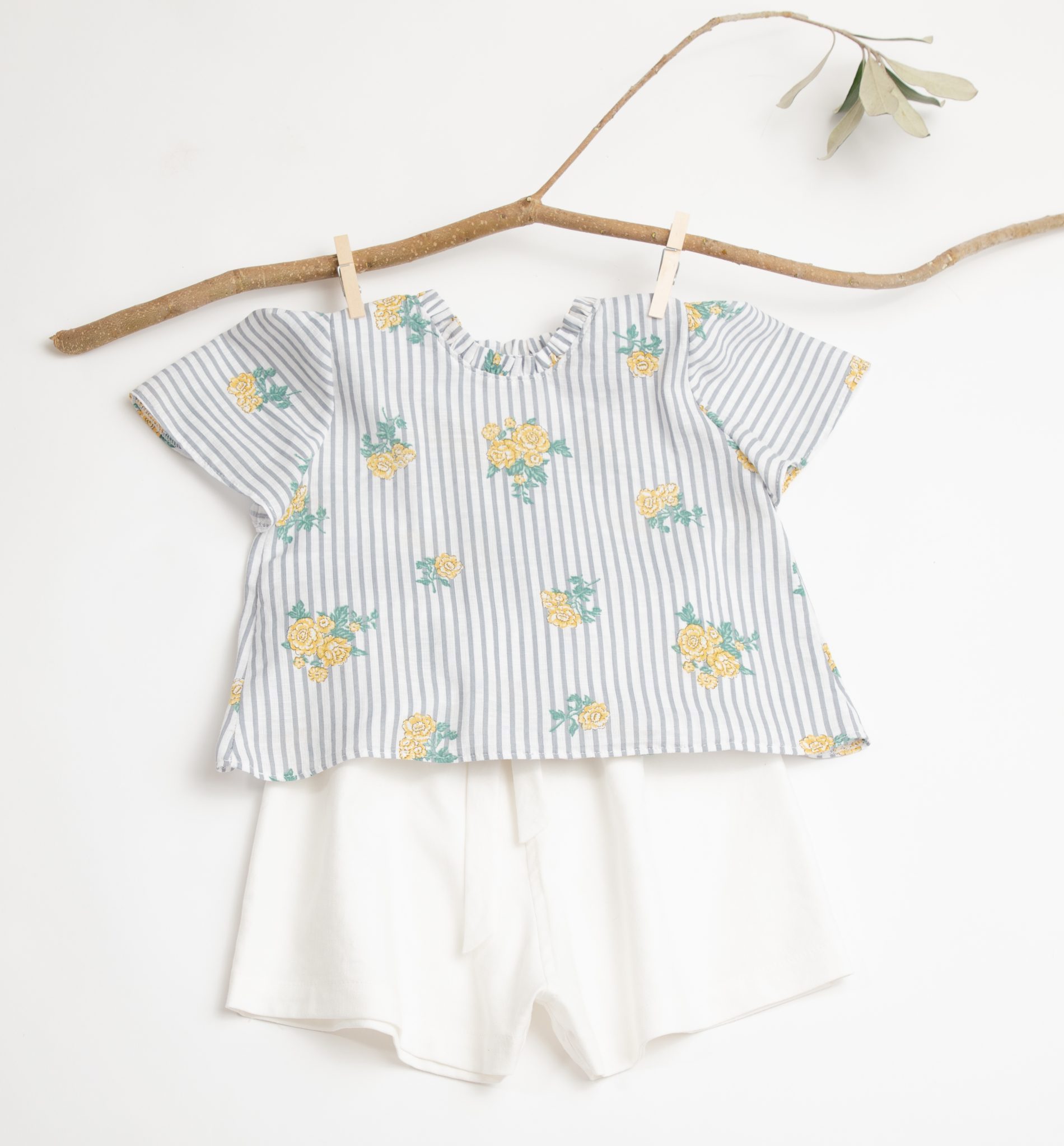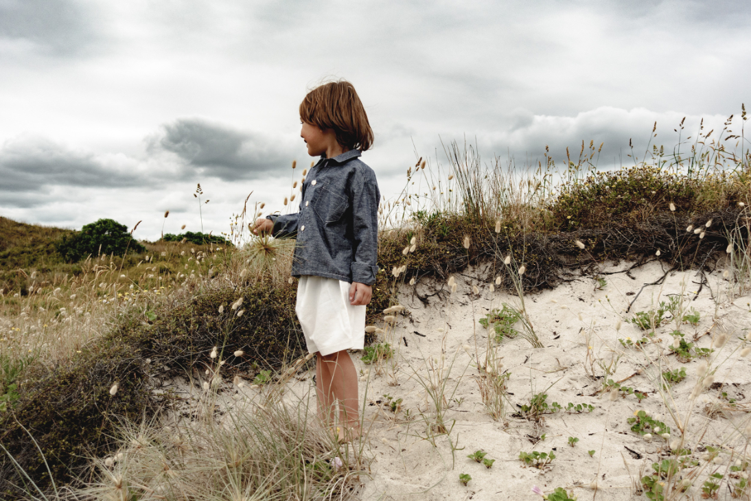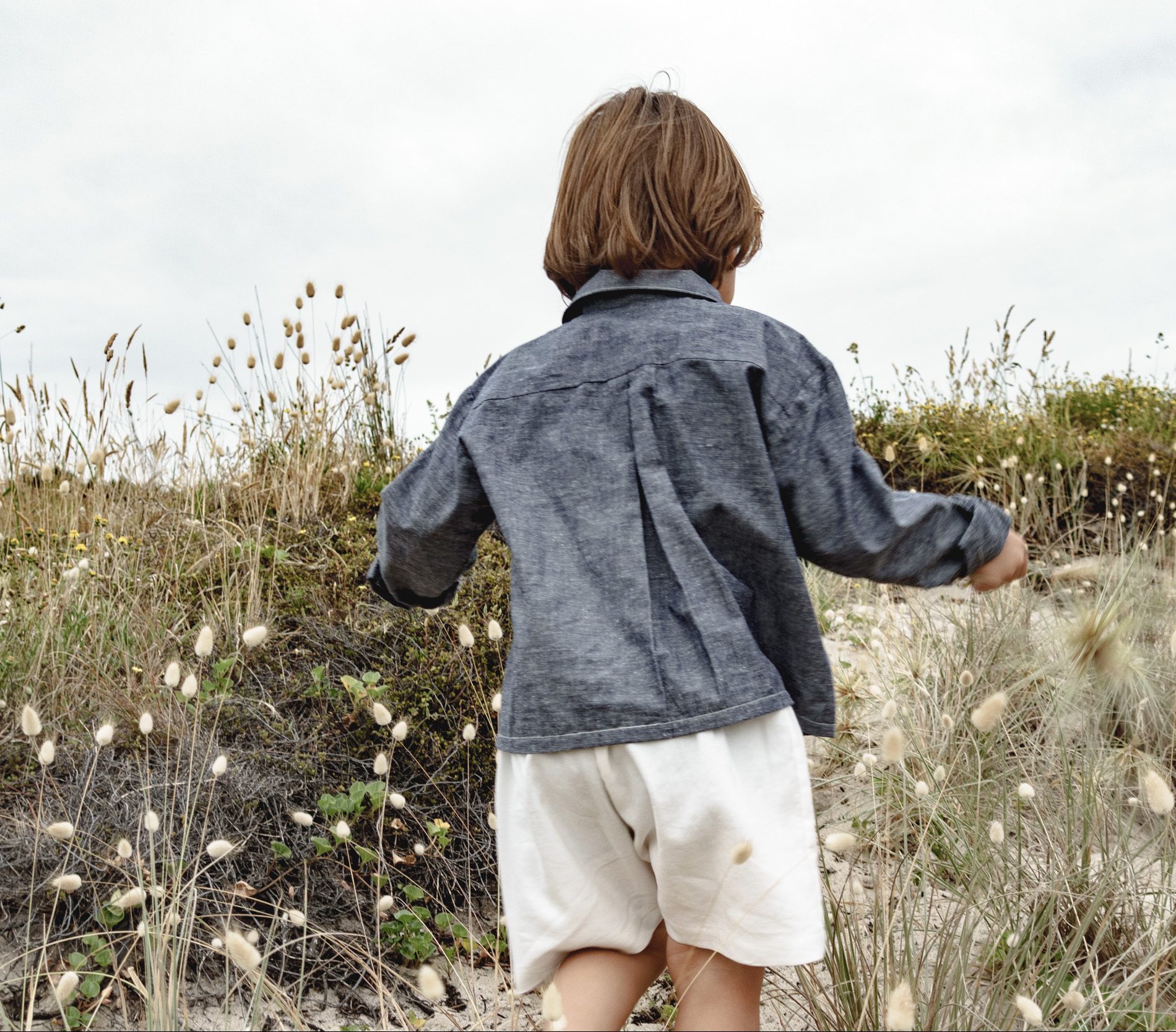 Team with our yellow eucalyptus top or velvet swing coat. And for boys try the blue Chambray shirt (as seen in our model), or the thyme stripe linen knit tee.