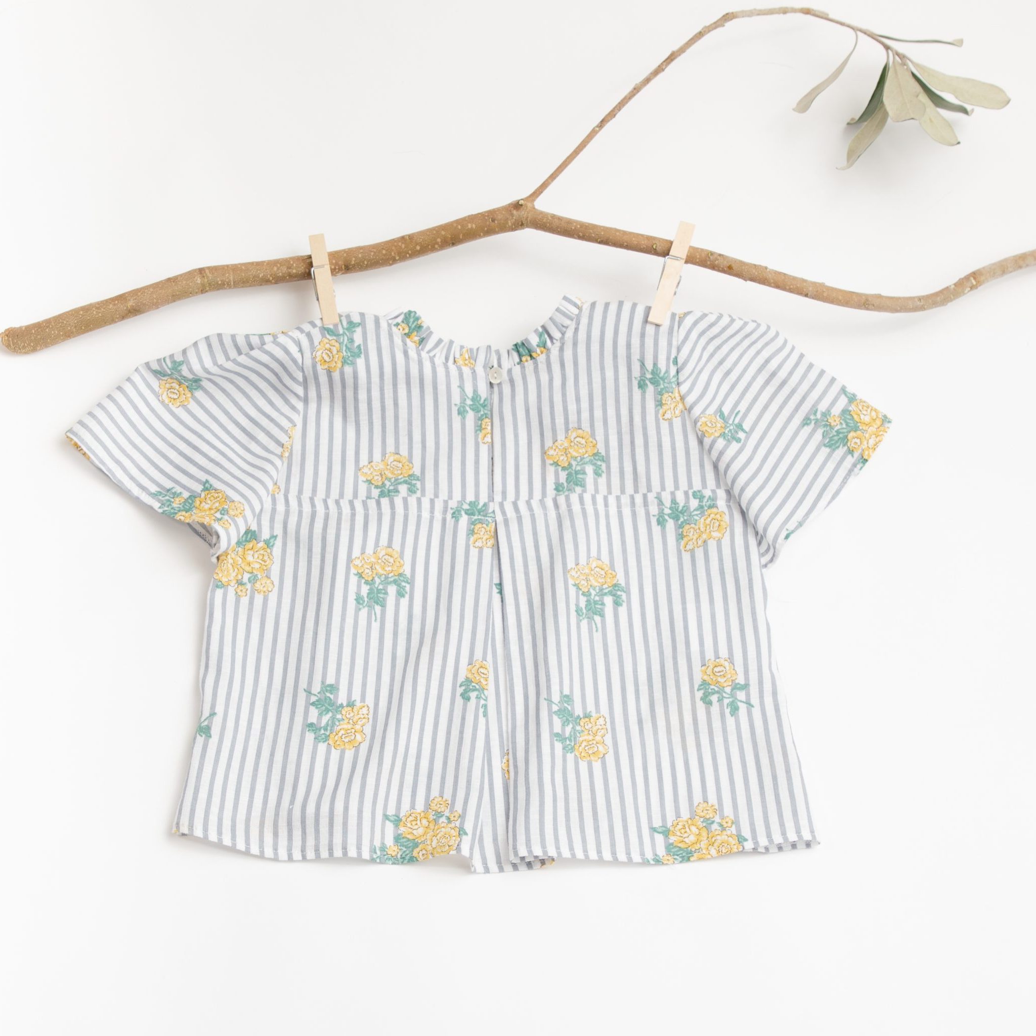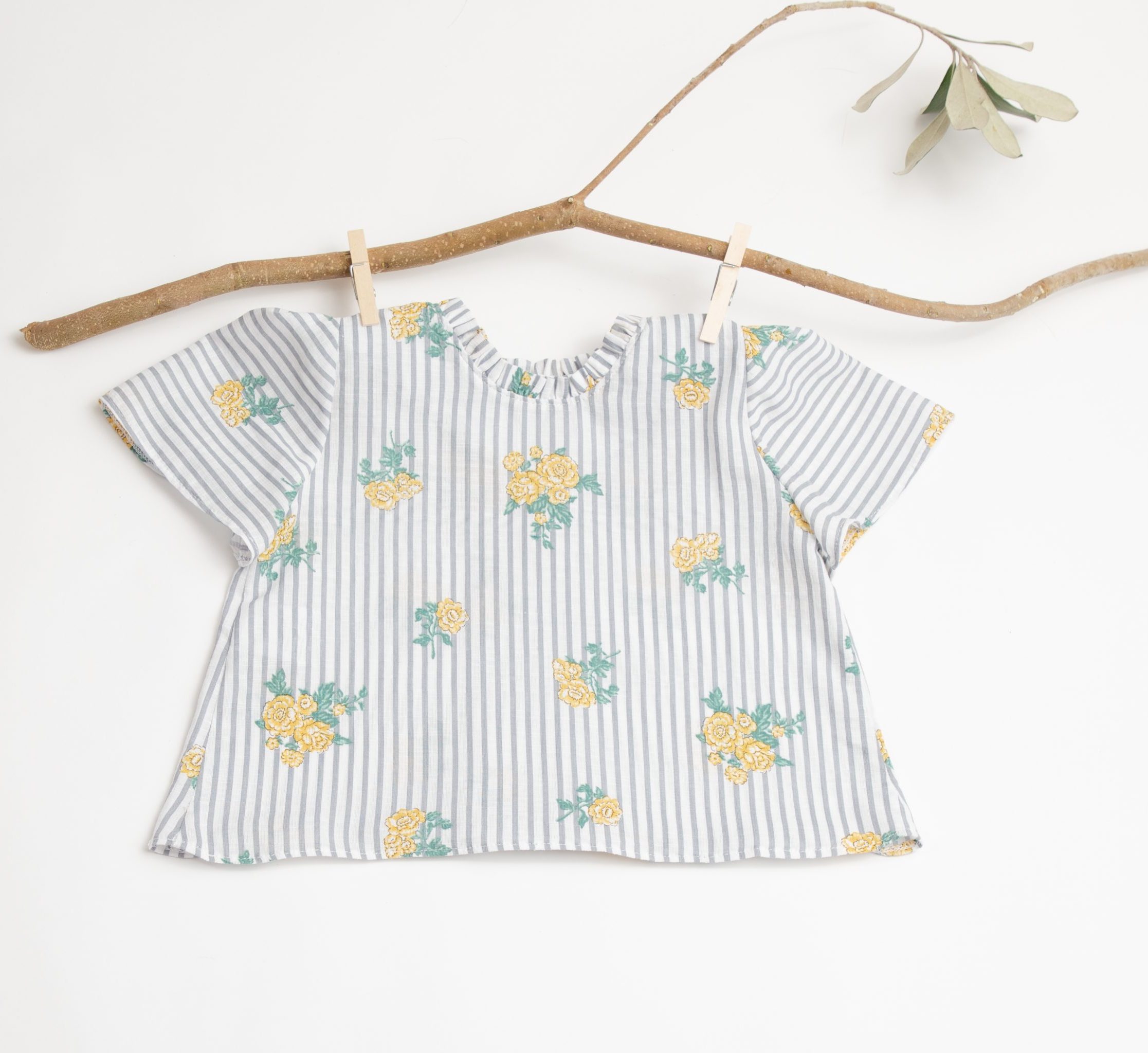 This cute & cool lightweight top has a  yoke back and attaches with a small shell button.